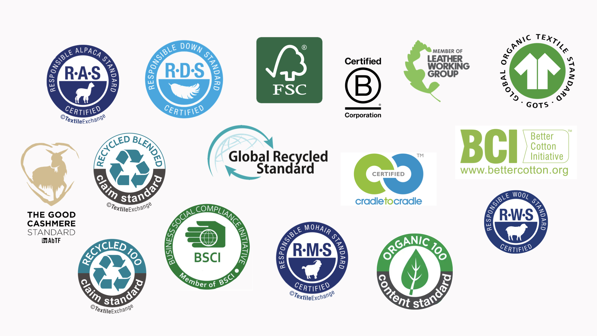 Per le fibre di origine animale esiste una famiglia di standard coordinati da Textile Exchange, ciascuno dedicato a una specie diversa. Il Responsible Wool Standard (RWS) certifica lana da pecore allevate senza mulesing e su terreni gestiti responsabilmente. Il Responsible Alpaca Standard (RAS) fa lo stesso per l’alpaca, il Responsible Mohair Standard (RMS) per le capre d’angora, il Global Cashmere Standard (GCS) per il cashmere. Quest’ultimo è particolarmente importante dato il problema della desertificazione delle steppe mongole.